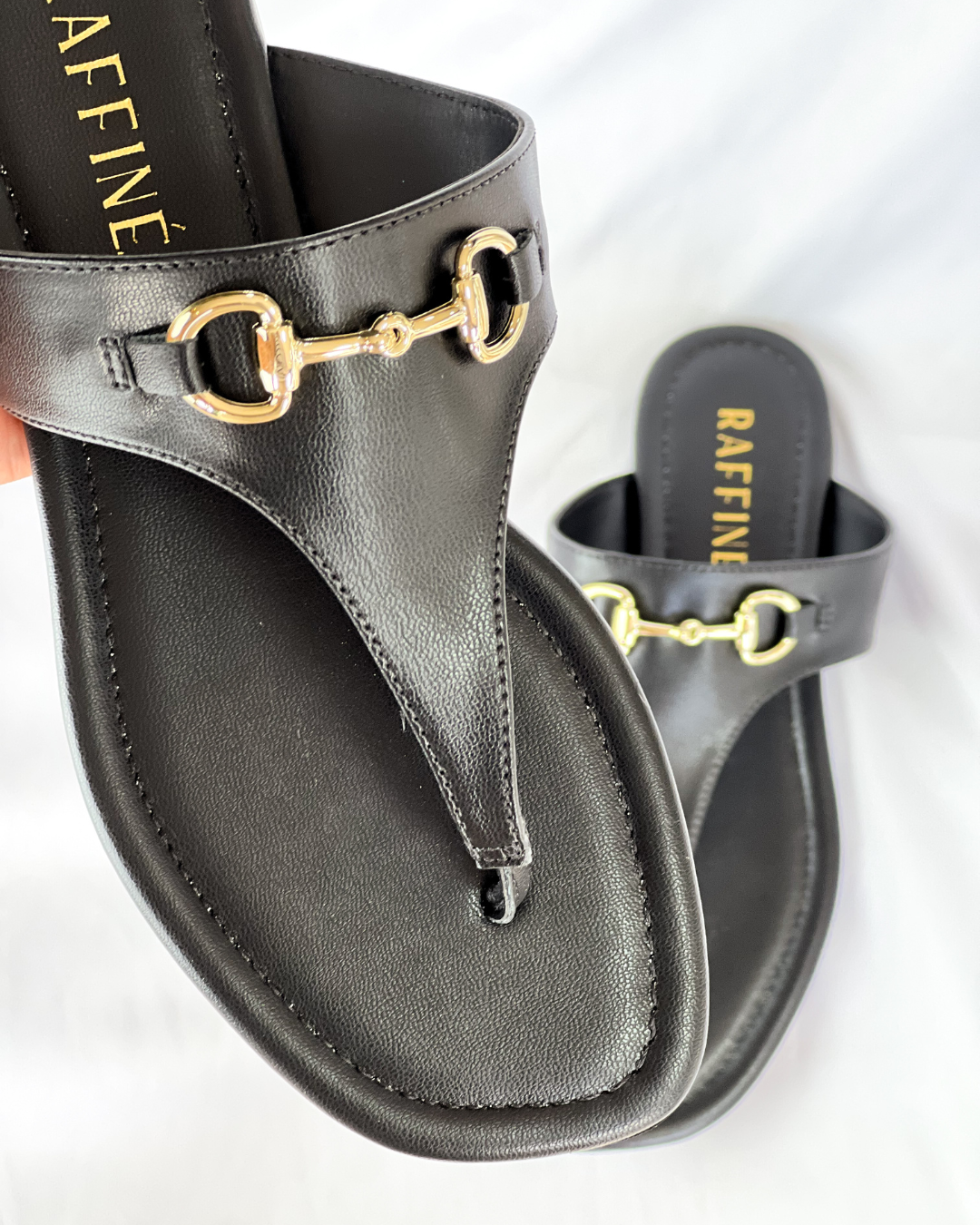 O design é minimalista e chique, e o detalhe dourado remete ao estilo preppy e equestrian (hípico), conferindo um charme instantâneo. A palmilha macia com a marca Raffiné em dourado complementa a estética luxuosa. É uma sandália extremamente versátil, que vai do look casual com jeans a produções mais arrumadas com vestidos ou calças de alfaiataria.